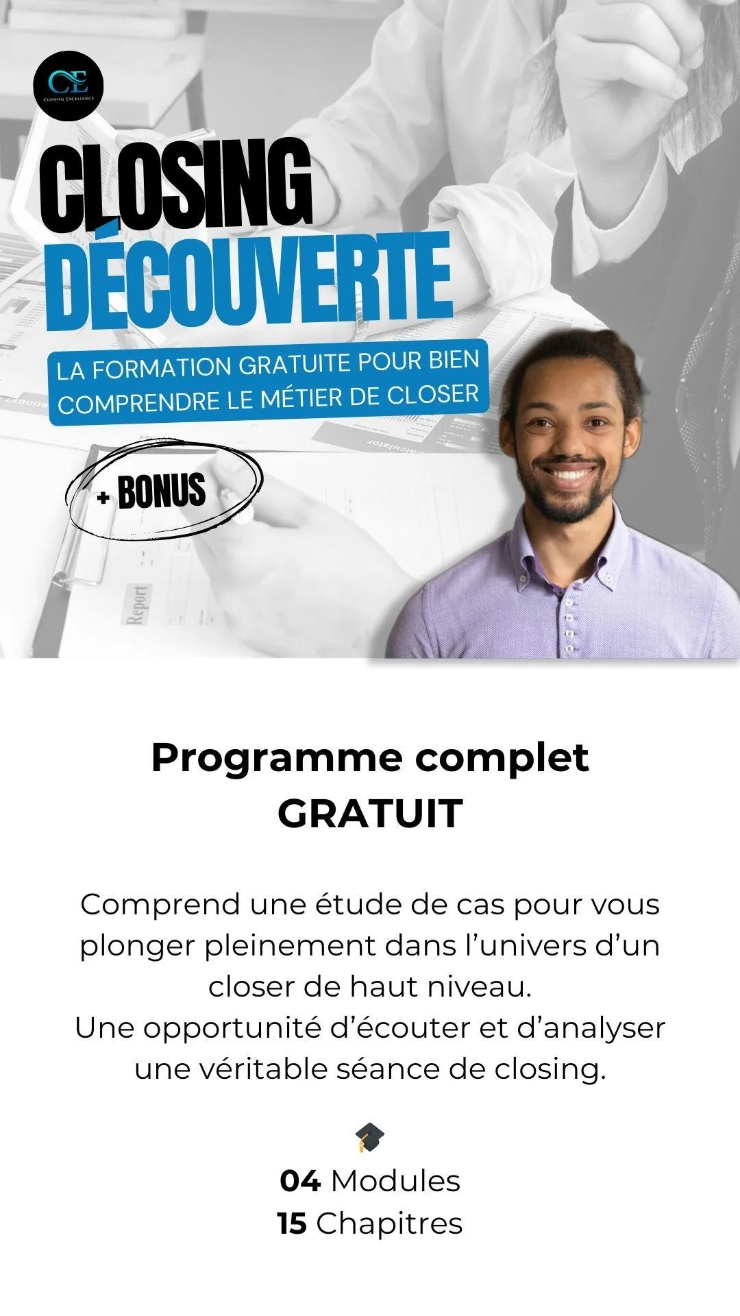 Étude de cas complète avec analyse - Vous serez immergé dans une étude de cas complète de closing. Vous analyserez les tactiques utilisées, les défis rencontrés et les résultats obtenus. Cette étude de cas vous donnera un aperçu précieux de la manière dont les closers professionnels opèrent dans le monde réel.